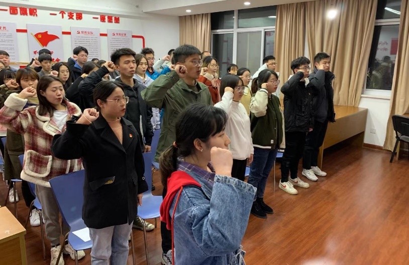 胸前佩戴党员徽章,伫立党旗前,现场气氛十分庄重。仪式在《国际歌》的歌声中开始,张晨东宣读了36名新党员名单。公司优秀共产党员郝丽娜带领36名新发展的本科生和研究生预备党员进行了入党宣誓。接着,本科生代表王佳琪、研究生代表马佳佳致敬中国共产党,表明了自己的决心以及今后努力的方向。最后,王永刚副书记向新党员们表示衷心的祝贺,并提出几点希望:一是要加强党性,不断提高自身的思想政治觉悟;二是要有坚定的信仰,守好意识形态阵地;三是加强学习,通过理论学习去坚定信仰;四是党员要有奉献精神,常思考“我能为组织做什么?”;五是扎根于群众,党员同志要吃苦在先,发挥先锋模范作用。