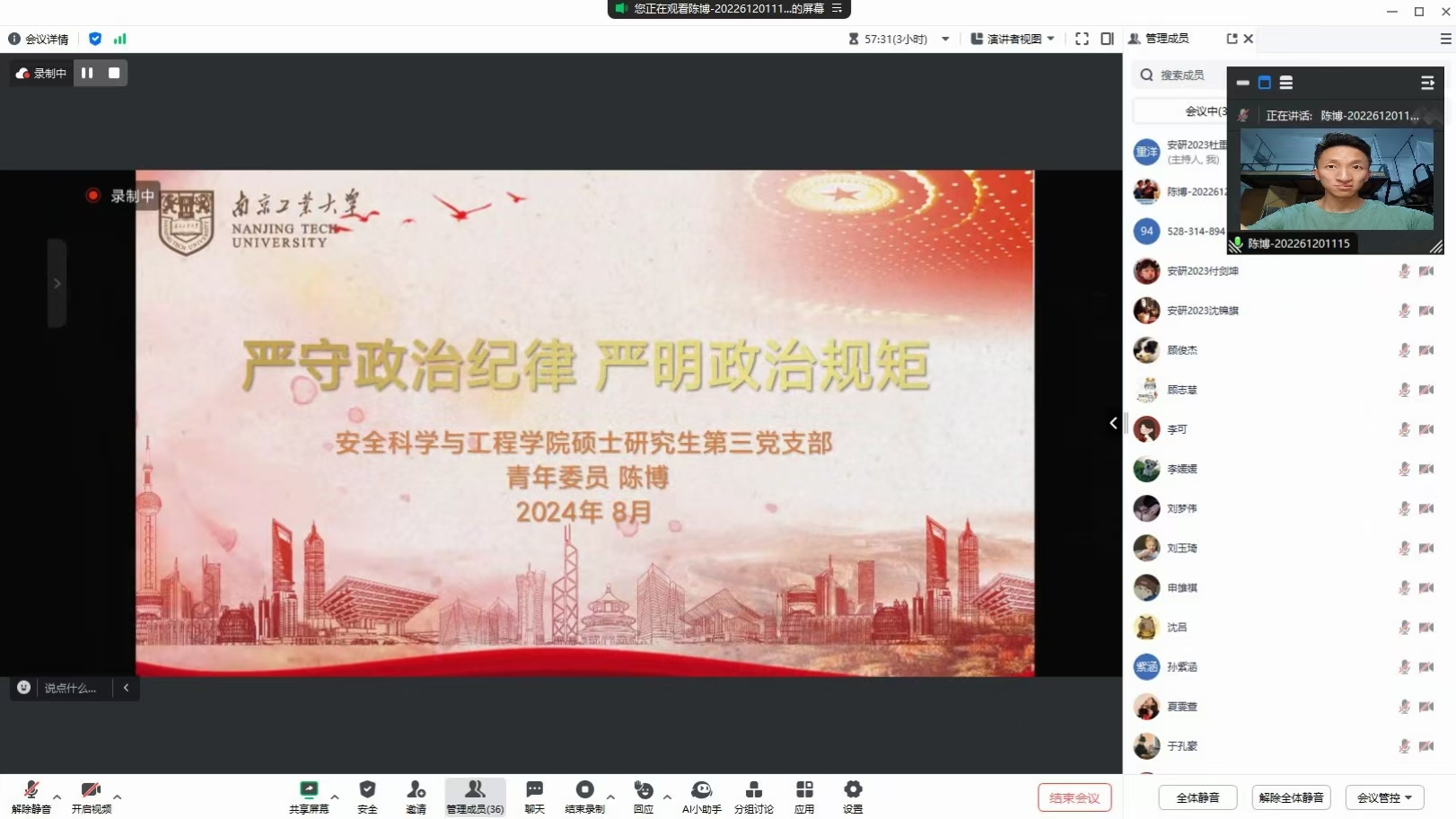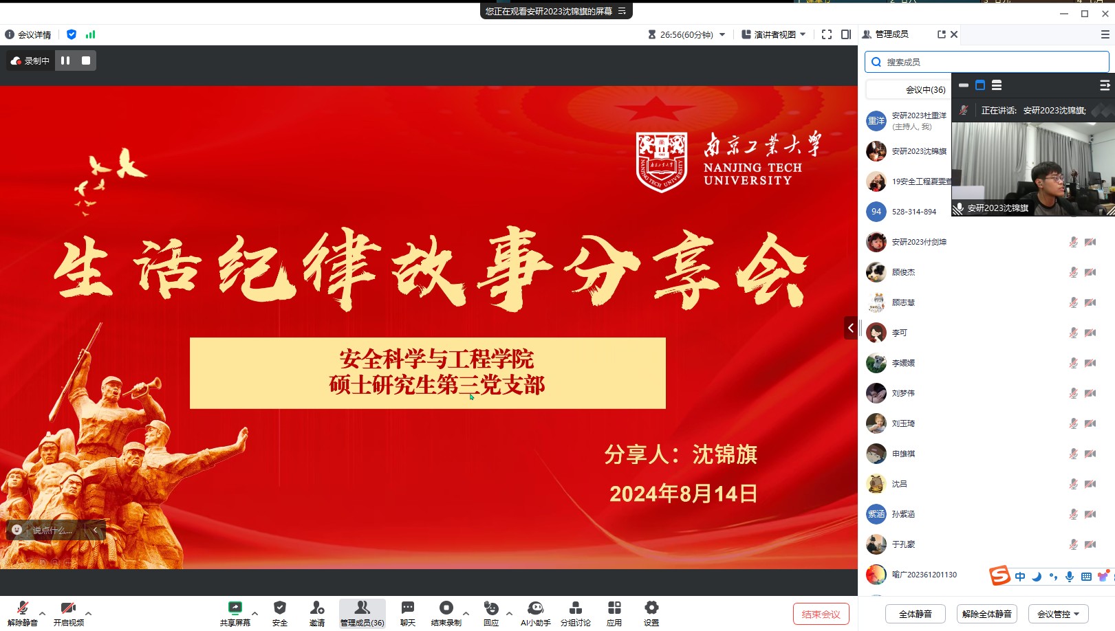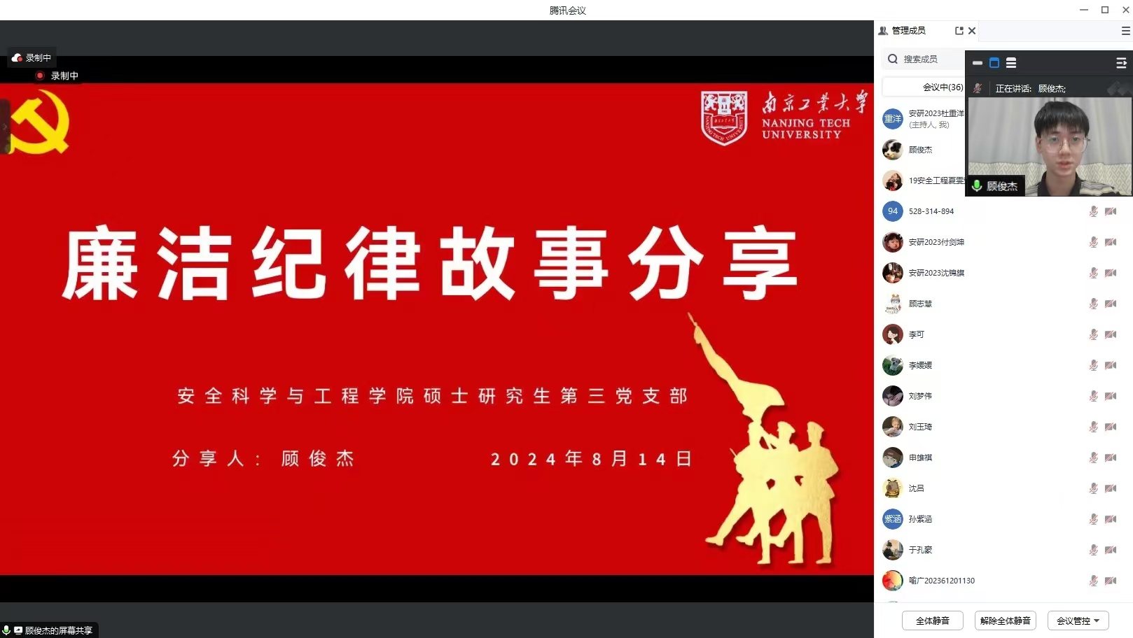 会上,支部党员陈博、顾俊杰聚焦《中国共产党纪律处分条例》,结合自身学习经历,分享了对党纪学习教育的深刻感悟与体会。入党积极分子沈锦旗、沈吕、喻广、于孔豪等几位同学紧扣主题,用质朴的语言和真挚的感情分别讲述了革命先烈、英雄人物、优秀共产党员的光辉事迹,形象生动地再现了中国共产党百年风雨历程中发生过的一幕幕严以律己、感人肺腑的党纪故事,展现了共产党人纪律如铁、信念如磐的风范,感染了现场的每一位同学,引起了大家的强烈共鸣。