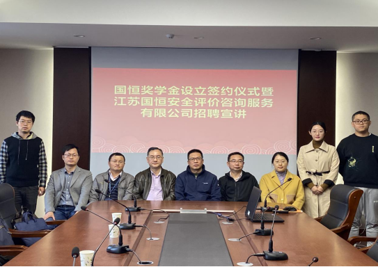 11月20日上午,江苏国恒安全评价咨询服务有限公司总经理尤文辉一行到访太阳集团tyc33455官网,在公司学科楼111会议室,举行“国恒”奖学金签约仪式暨江苏国恒安全评价咨询服务有限公司专场招聘会。太阳集团tyc33455官网经理潘旭海、副经理周汝、研究生辅导员钱露、本科生辅导员史帆、李敬以及研究生、本科生员工代表出席仪式。