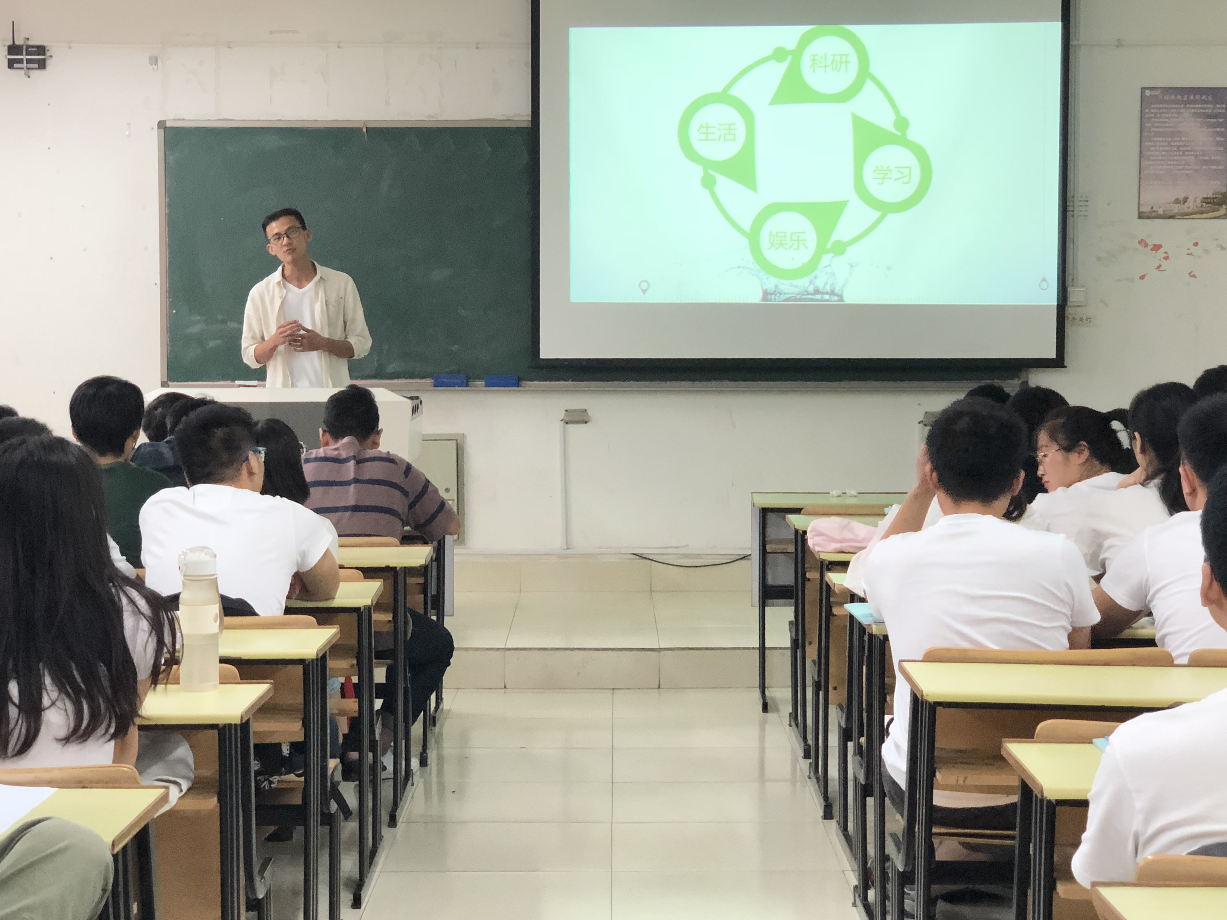 随后,辅导员助理、16级研究生傅刚同学以自身为例,分享了自己读研的规划,并就课题的申报等方面谈了自己的经验与感悟。他建议同学们在研究生期间能够高度自律,保持良好的科研心态。之后,研三党支部书记马驰同学以“读研生活”为主题,向新生们介绍了个人的发展规划、研究生期间项目工作对就业的帮助以及南京的特色景点,希望同学们能够在研究生期间提高效率,懂得取舍,学会反思。接着,辅导员助理、原16级研究生班长、18级直博生刁旭从科研、生活、学习、娱乐四个方面入手,期望同学们重视读研期间的学习能力、专业能力、英语能力和综合能力,并对研一到研三的生涯规划也提出了自己的建议。接下来,16级博士班班长、国家奖学金获得者汪志雷以一段新颖精彩、动感十足的视频作为开场,将现场氛围推至高潮。之后,他从方向、技术、资源、运气这四个方面详细阐述了从读研到读博以来发表论文的历程,鼓励同学们早做打算,早出成果。最后,由党建助理、17级党支部书记颜鹏向大家介绍了研究生入党的详细流程,并向新生们说明了入党的一系列要求。同时,颜鹏也希望18级新生团员们能够把握机遇,努力创造科研成果,积极参与员工工作,坚定入党信念。