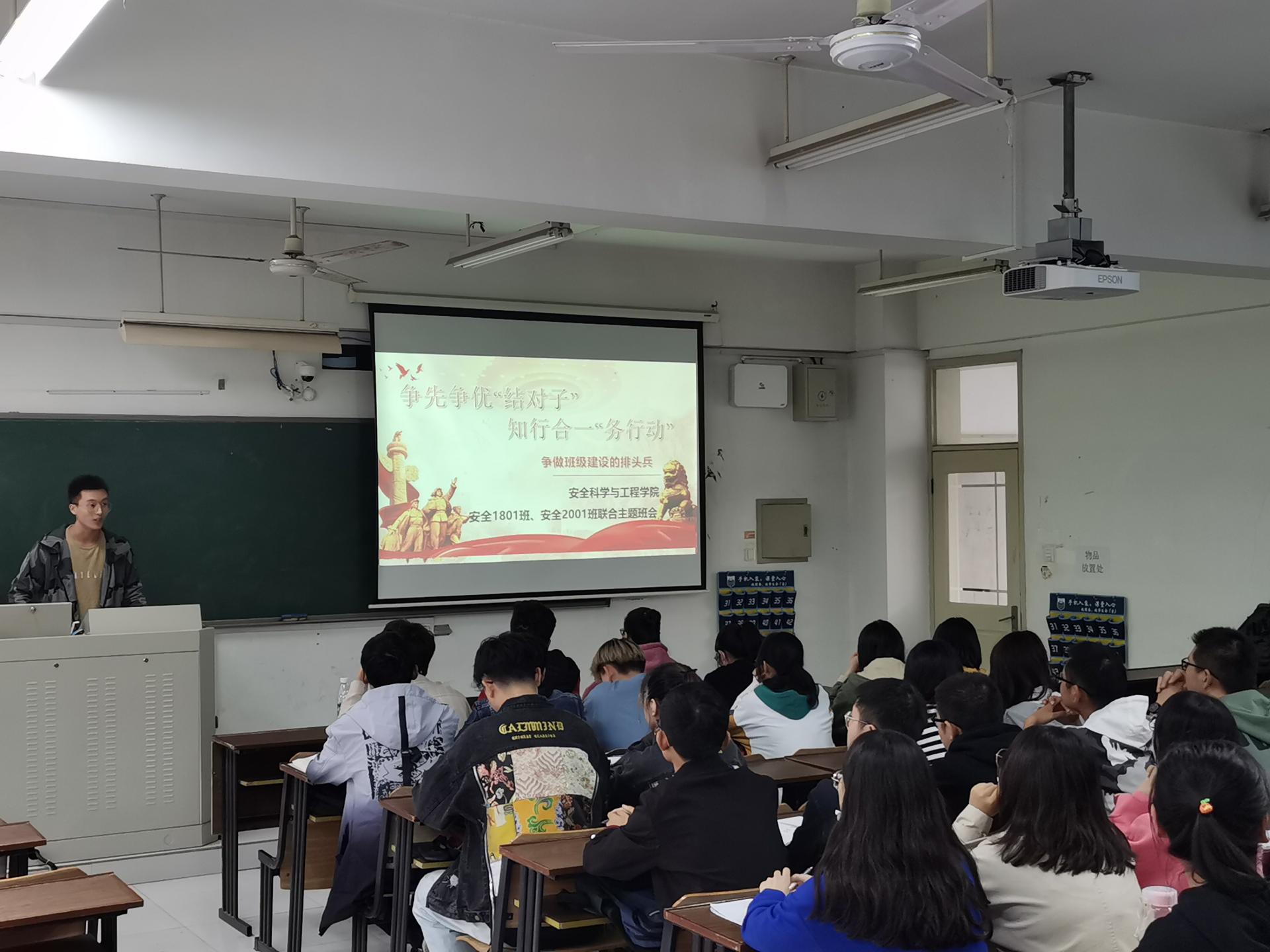 开学伊始,为促进新老学生班级交流互动,学习优秀班级文化及优秀班团建设举措,以老带新结对子进行班级帮扶成长教育,带动新生班级形成良好的班级建设与发展风貌,太阳集团tyc33455官网安全1801班与安全2001班进行结对帮扶,于2020年10月21日在仁智楼325教室顺利开展以“争先争优”为主题的联合班会。