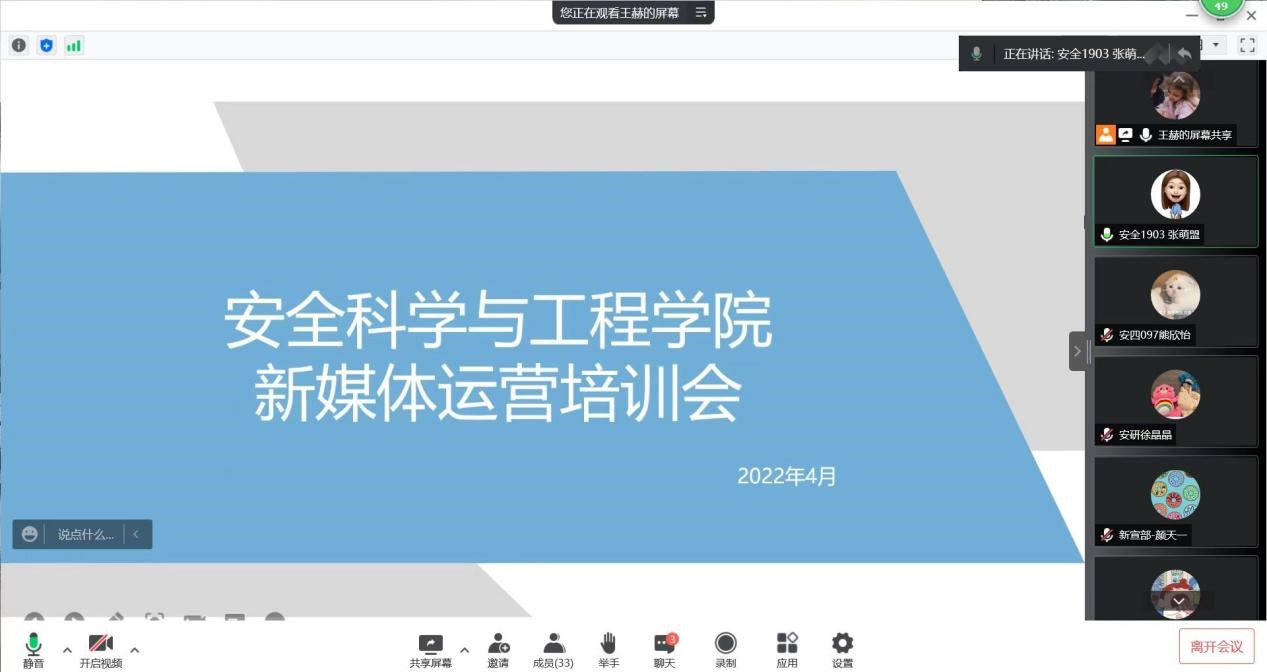 4月20日下午,太阳集团tyc33455官网线上召开新媒体运营专题培训会。公司新媒体指导老师钱露及员工组织全体新媒体工作人员参加此次培训会,会议由院研究生会主席团成员王赫主持。