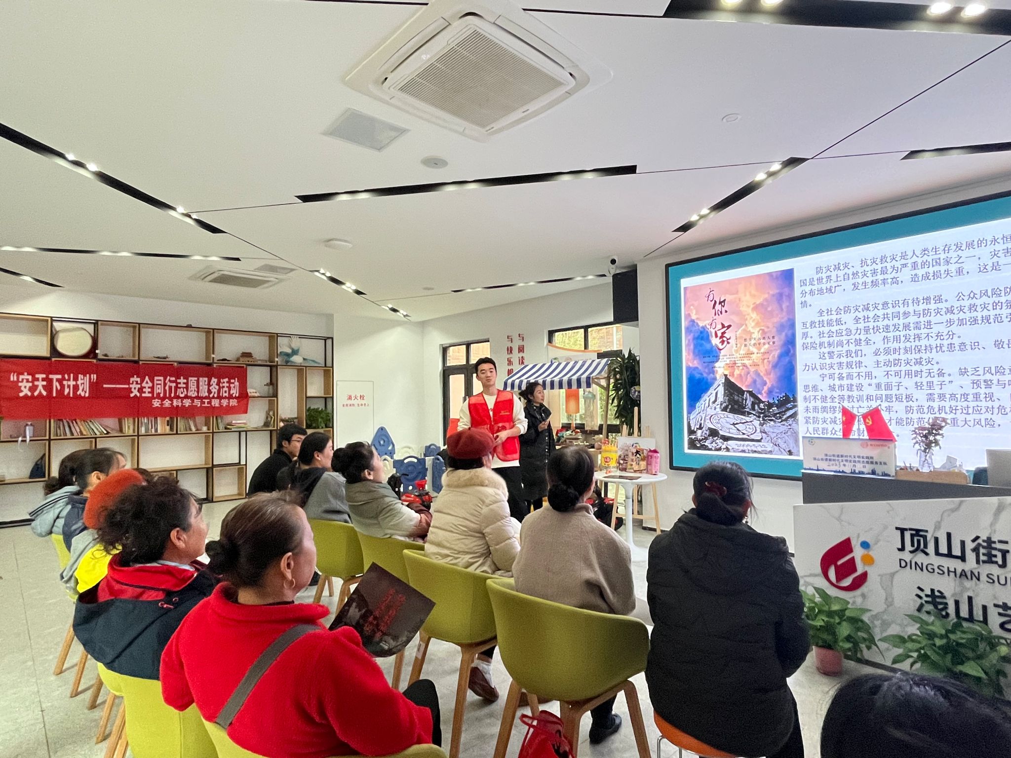 活动伊始,活动成员王子鹏同学围绕“防震减灾”主题向社区居民展开宣讲。首先,王子鹏通过引入我国防灾减灾事例,帮助社区居民们意识到防灾减灾的重要性。随后,他通过灾害的定义与分类、常见的自然灾害以及防震减灾的具体措施这三个章节分别展开论述。宣讲结束后,现场开展了防震减灾知识有奖问答互动环节,居民们积极竞答相关问题,领取精美奖品。最后,同学们通过短视频宣传了有关洪涝、火灾、地震等自然灾害的自救知识,提醒了居民保持时忧患意识,增强了居民风险防范和自救互救能力。