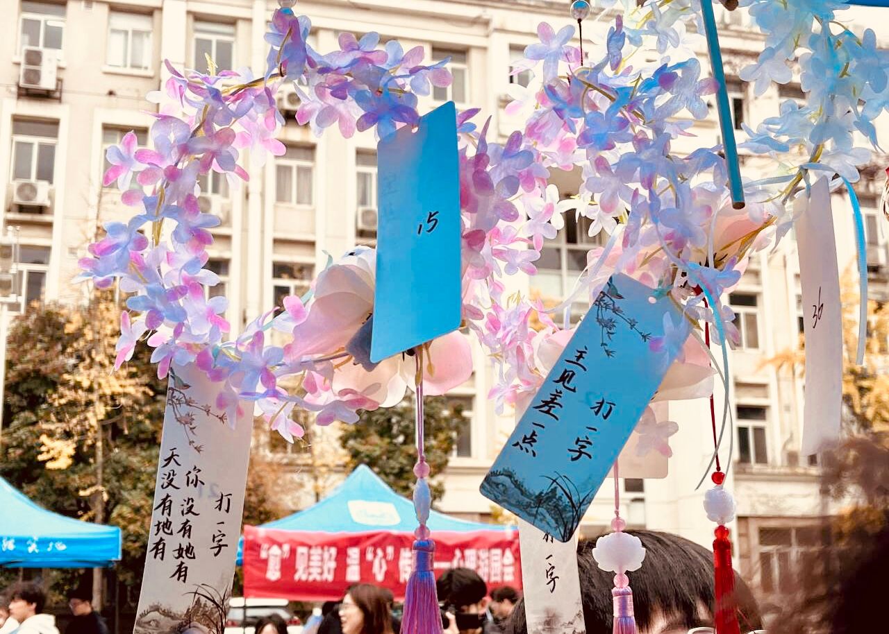 本次活动设计了团扇DIY、纸灯制作、灯谜竞猜、你画我猜等形式多样的沉浸式创意项目。同学们在竞赛互动和手工创作中放松身心,减轻压力。游园会现场,同学们释放了压力与焦虑,感受到了爱与温暖。