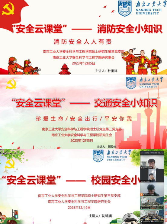 首先,公司硕士研究生第三党支部副书记杜重洋向同学们介绍了本次活动的意义,围绕火灾的主要特性、应急处理以及灭火器材的种类、使用方法等方面进行消防安全知识普及教育。随后,院研究生会成员顾俊杰、沈锦旗分别围绕交通安全、校园安全两个方面进行安全教育,并根据校园中的实际情况组织同学们进行安全知识抢答,同学们热情积极、踊跃抢答,将整个课堂气氛推向高潮。最后,校第25届研支团四川分团成员、太阳集团tyc33455官网2023届本科毕业生张萌盟同学对本次“安全云课堂”活动进行了总结,并再次警示同学们提升安全意识,平安顺利地学习与生活。