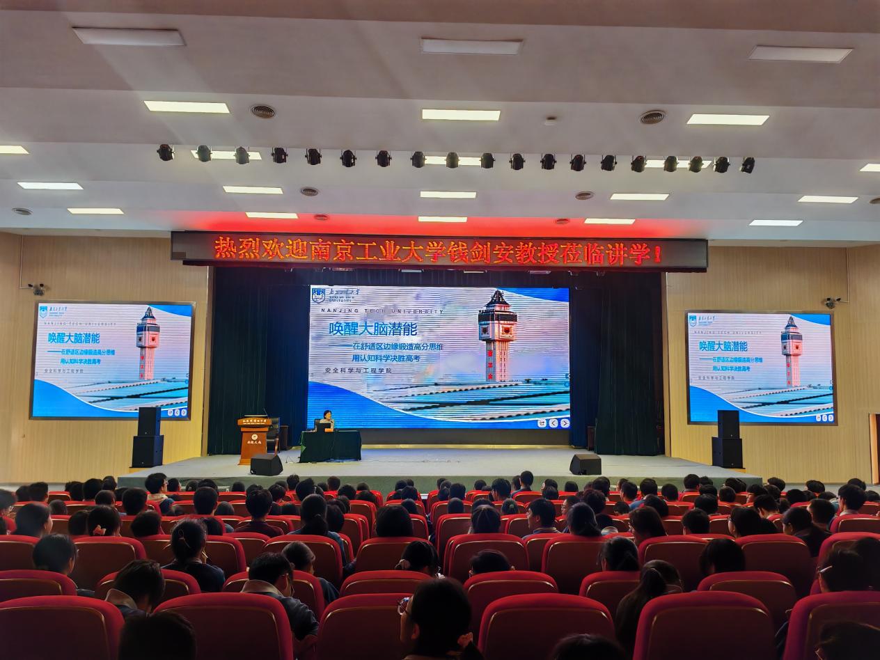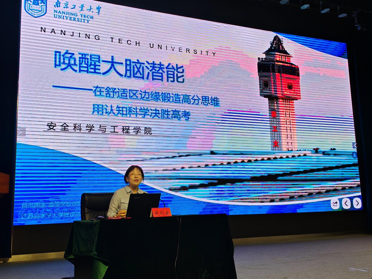 随后,安全公司副教授钱剑安以“唤醒大脑潜能——在舒适区边缘锻造高分思维,用认知科学决胜高考”为主题,为师生们带来了精彩宣讲。她从内观自己、外观世界、共同改变三个角度出发,和同学们分享了认识大脑、认知世界客观规律、提升专注力行动力的方式方法,鼓励同学们掌握科学方法、突破舒适区、养成良好习惯从而不断提升自我、勇创佳绩。