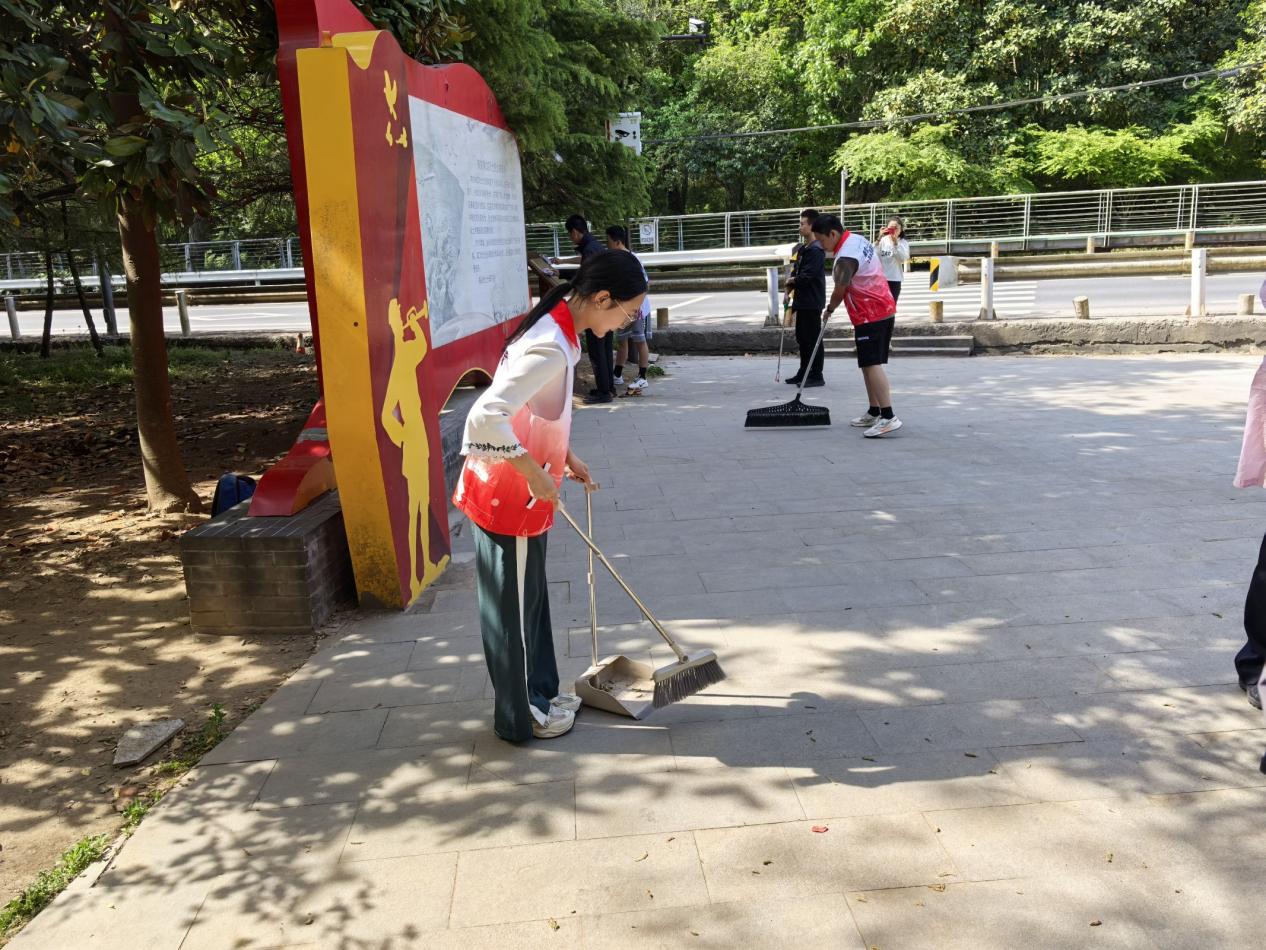 追寻红色记忆,感悟初心使命。活动伊始,在场师生认真聆听浦口无名烈士陵园的历史背景与烈士们的英勇事迹。随后,在庄严肃穆的烈士纪念碑前,两校师生列队肃立,由江苏警官公司员工代表领誓,全体人员紧握右拳庄严宣誓:“继承三浦英烈遗志,弘扬五四爱国精神。铭记历史,团结奋进,强国有我,不负时代!”誓言铿锵有力,展现了青年学子赓续红色血脉、勇担时代重任的决心。宣誓结束后,师生们依次缓步上前,向无名烈士纪念碑敬献鲜花并鞠躬默哀,表达对英烈的深切追思。最后,两校青年志愿者分工协作,对陵园内的道路、纪念碑和绿化带进行清扫维护。