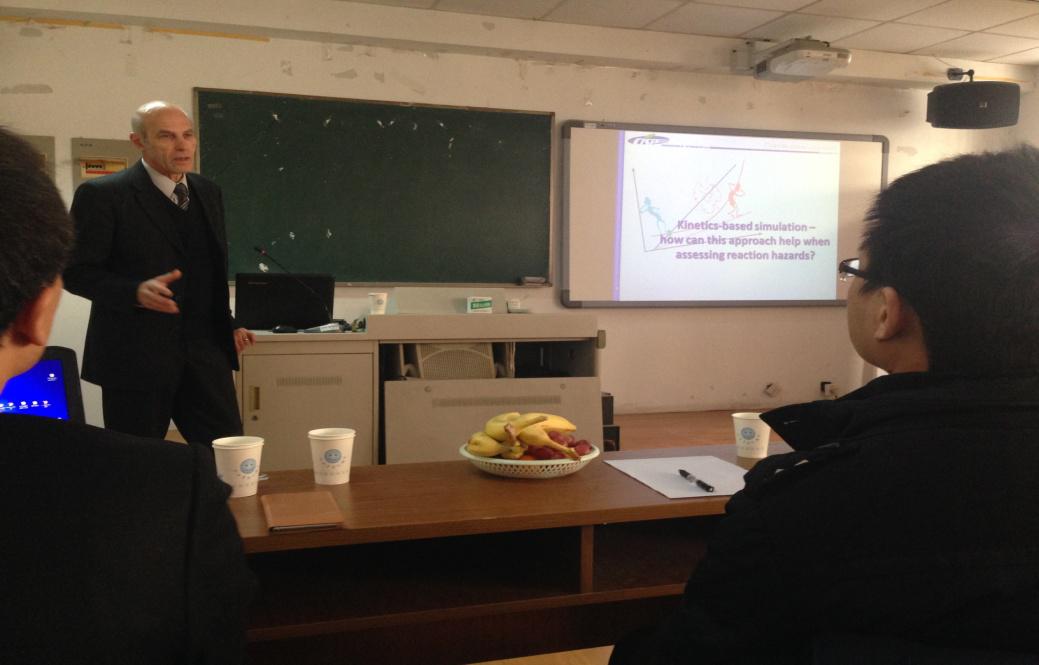 Arcady博士首先向各位老师及博硕士研究生作了题为“Kinetics-based simulation-how can this approach help when assessing reaction hazards?”的学术报告,主要介绍了热分析数据处理、动力学模拟等相关方法和研究进展。报告后,与在场的师生进行了热烈互动,对员工们提出的相关问题进行了详细的解答。