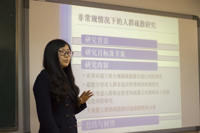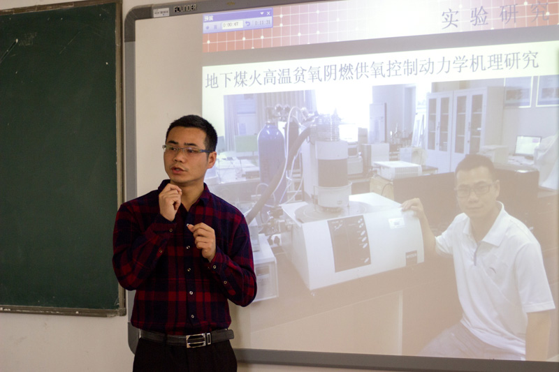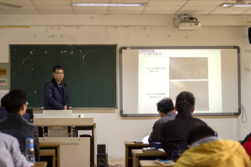 上午,宋泽阳博士以“大尺寸煤田火灾阴燃机理及卫星遥感探测关键技术研究”为题,从煤田火灾现状、实验研究、数值模拟等方面揭示其阴燃机理,并介绍现代先进技术--卫星遥感探测对大型煤田的阴燃状况进行监测的情况。接下来,周魁斌博士的“线火源诱发的火旋风”报告向大家讲解了火灾中的火旋风现象,周博士通过中长尺度实验和涡旋理论研究了直线火源诱发火旋风的物理条件,揭示了诱发物理机制;通过统计分析研究了风对火旋风出现频率的影响规律与机制。然后,王静虹博士通过“大规模人群的疏散路径选择随机性分析”,从应急管理研究现状与问题、大规模人群疏散研究现状、耦合疏散模型等方面分别介绍了应急疏散在非常规突发事件中的重要意义。马鹏博士以“共晶含能材料结构的理论研究”为题,向大家展示了什么是共晶化合物、共晶化合物形成机理、共晶化合物在工程中的应用等内容。最后,龚俊辉博士的“非碳化聚合物热解着火及火蔓延机理研究”报告,深入探讨了非碳化聚合物热解机理并通过先进实验仪器进行实验验证,强调实验研究在科学研究中的重要作用。