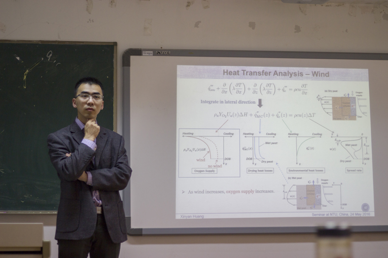 黄鑫炎博士首先简单介绍了全球泥炭阴燃严重性及其危害,简要说明了泥炭的产生和形成,以及泥炭的化学组成成分。然后重点讲述了目前他在泥煤阴燃研究领域取得的一系列研究进展和成果,主要包括零维多步化学反应机理及反应常数的计算、一维模型的构建及模拟、二维小尺寸的实验研究。在此基础上,引申出了“地球可燃极限”课题和进展,并提出了泥煤阴燃作为地球可燃极限的结论。在此过程中,黄博士与大家分享了他在研究过程中对于解决问题方法的思考与取舍,并强调了提出关键科学问题对于科学研究的重要性。